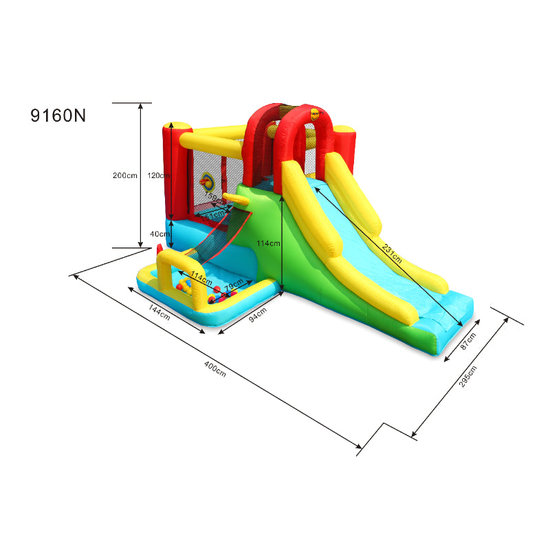 There's nothing better than having your own inflatable in the comfort of your own backyard. The Adventure Combo includes so many activities to occupy the kids for hours including a basketball hoop, ring toss, dart target, ball pit area.