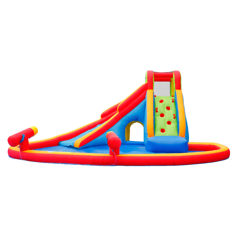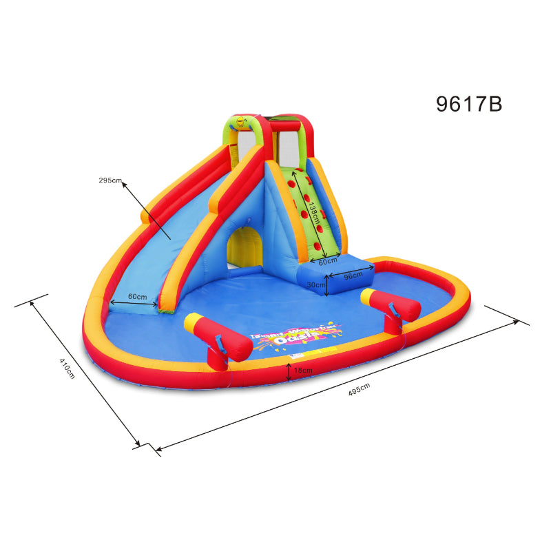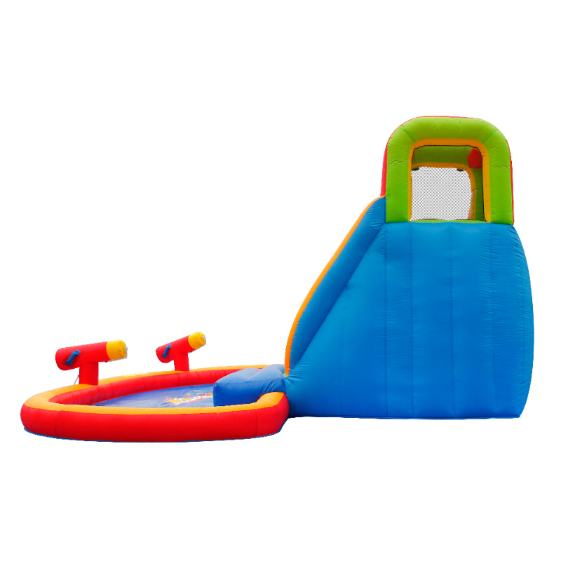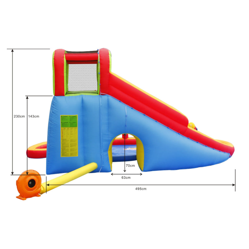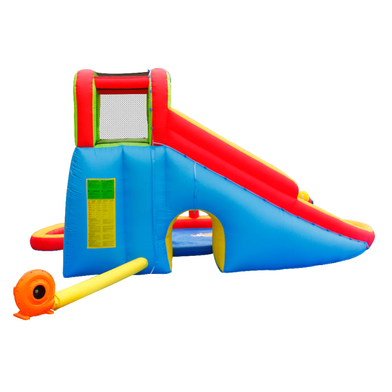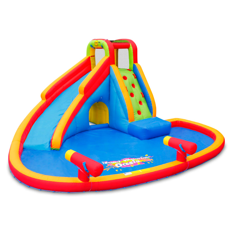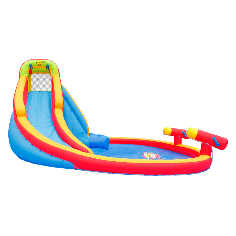 Experience endless summer fun with the Happy Hop Island Waterfall Oasis Double Blaster! Slide into the splash area, explore the hidden tunnel, spray friends with the water gun, and enjoy the flowing waterfall feature. The large pool area is perfect for multiple kids, making this colourful inflatable a backyard entertainment favourite.