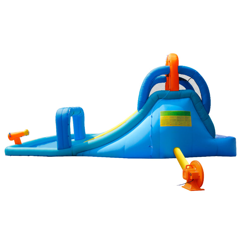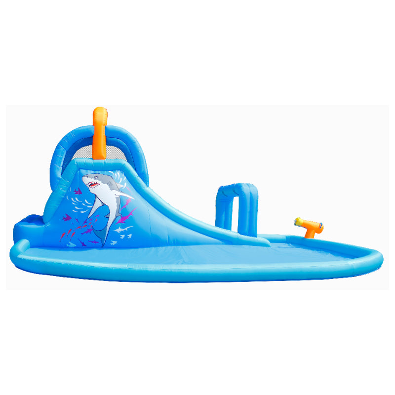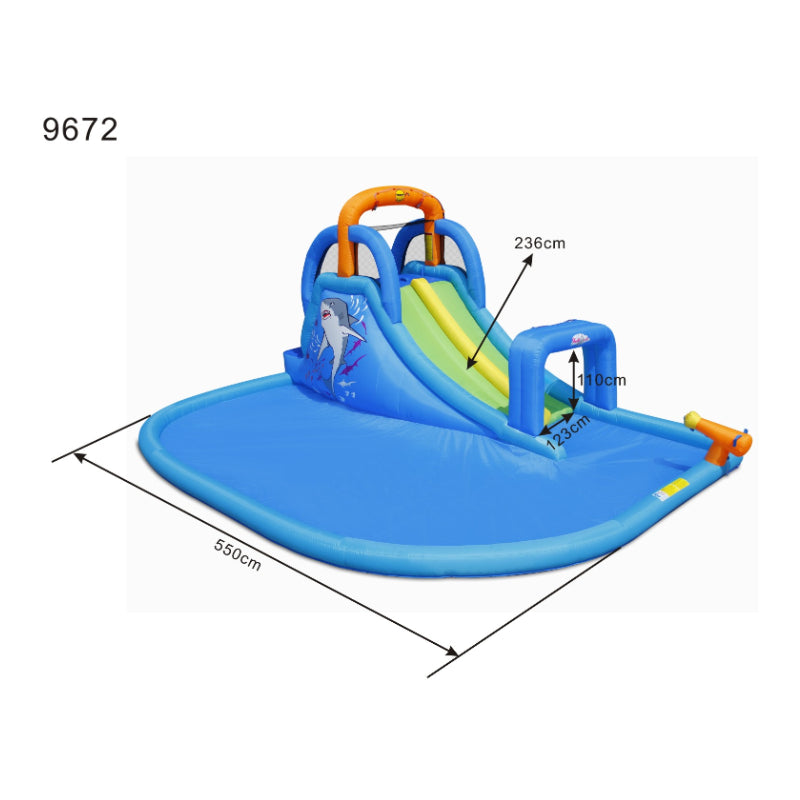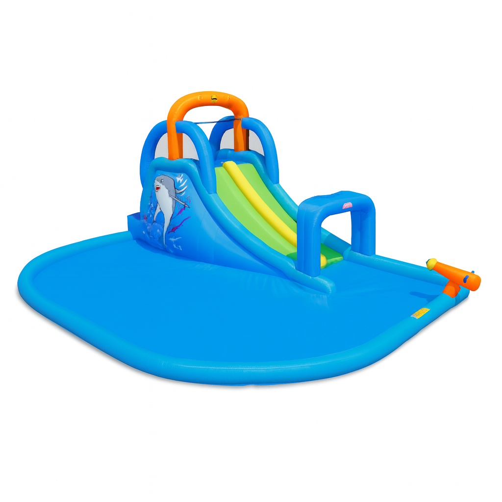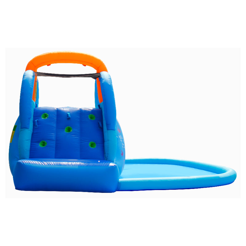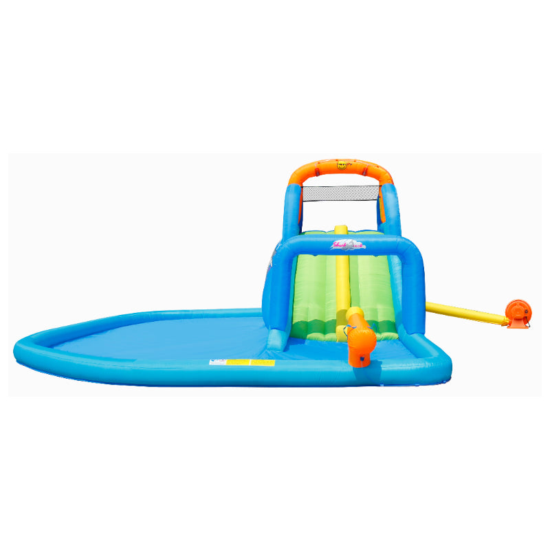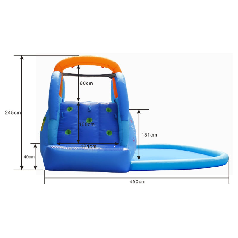 Watch all the children race down the double slide and through the hoop whist getting sprayed by water. The product also includes a fun climb wall, water cannon and massive pool area to make this the perfect entertainment option on that hot summers day.