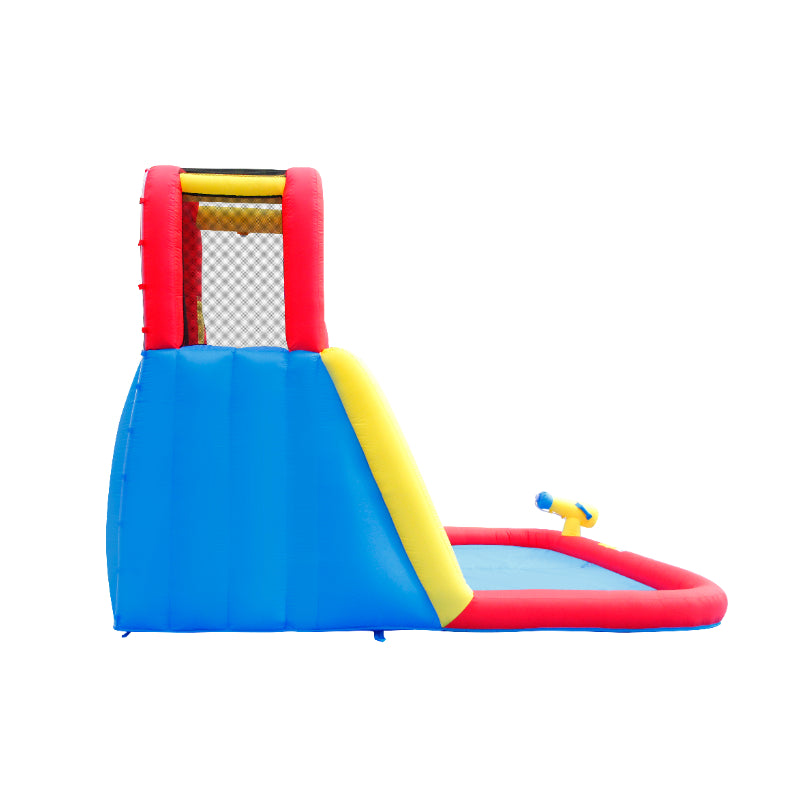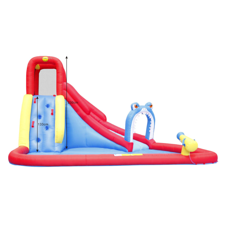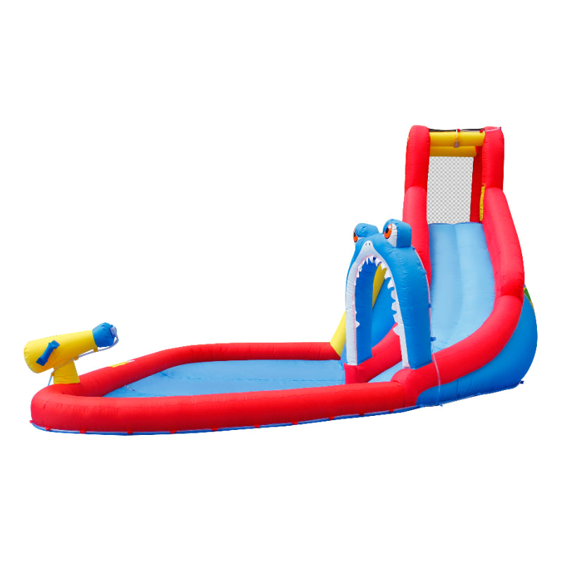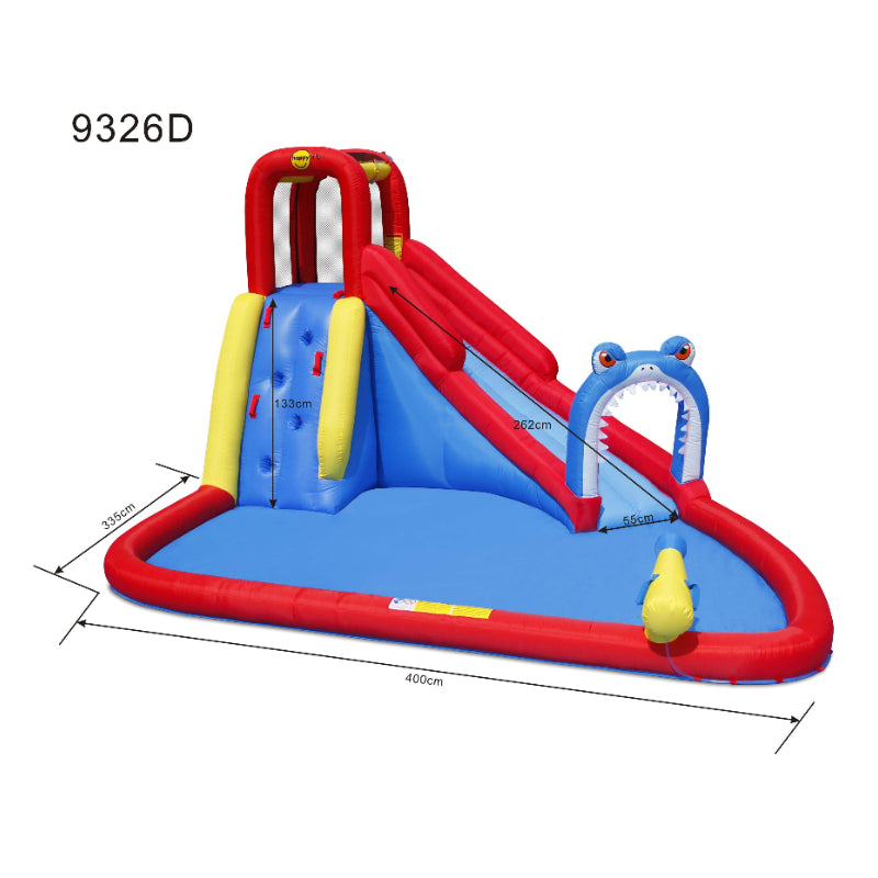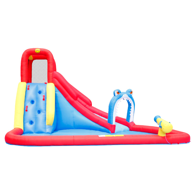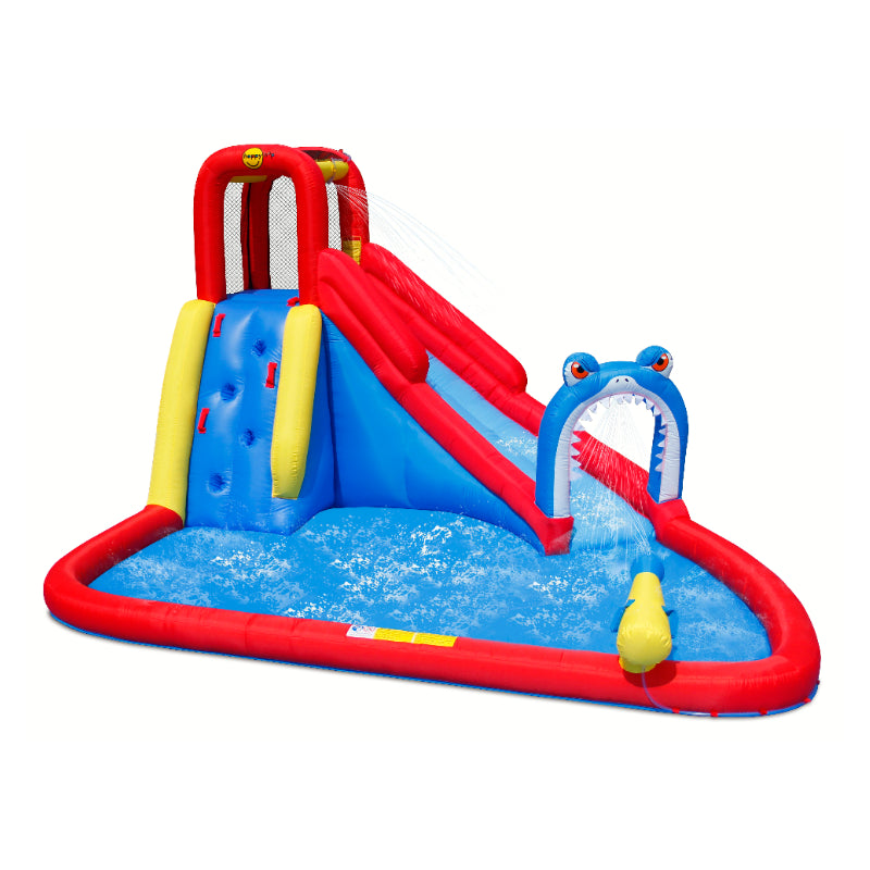 Introducing the Happy Hop Shark Attack! This exciting inflatable water slide features a shark-themed design, a refreshing splash pool, and a powerful water cannon for endless summer fun. Kids can climb up the wall and slide through the shark's jaw for a thrilling aquatic adventure. Get ready for hours of safe and exhilarating playtime right in your own backyard!
